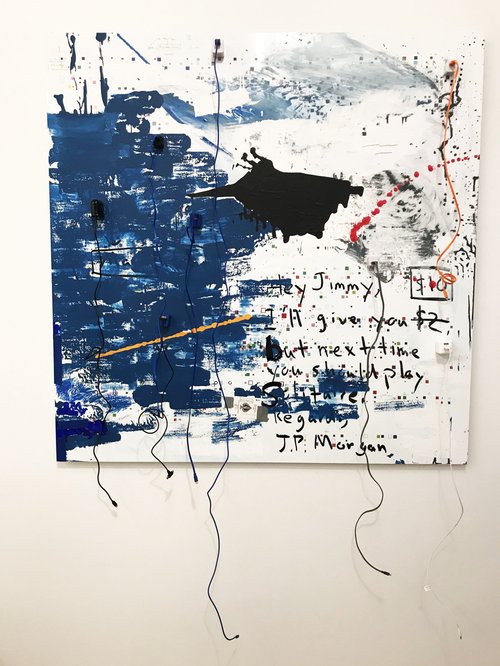 “What a Mess” tells the story of JP Morgan’s purchase of Bear Stearns through a complex personification and imagined exchange between the heads of each at different moments in time. During financial panics, the legendary investor J.P. Morgan was known for playing the card game solitaire while contemplating different strategies and bailouts. Jimmy Cayne, the ex-CEO of Bear Stearns, would regularly disappear from work to play bridge even as his firm plunged towards it demise. The failing of Bear Stearns led to JP Morgan (the firm not its deceased namesake) buying Bear for $2 (later upped to $10). These two elements motivate the fictional letter scribbled on the piece: "hey jimmy, I’ll give you $2 (10) but next time you should play solitaire. Regards, jp morgan."